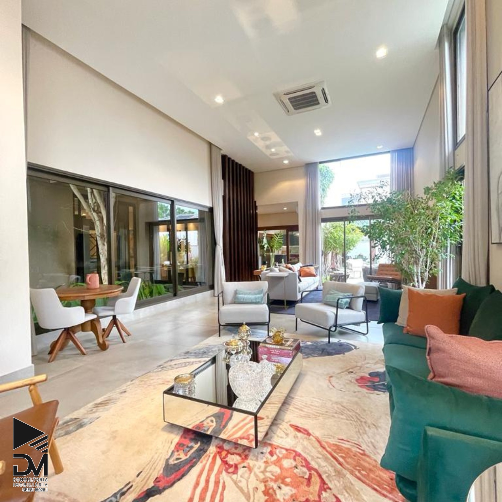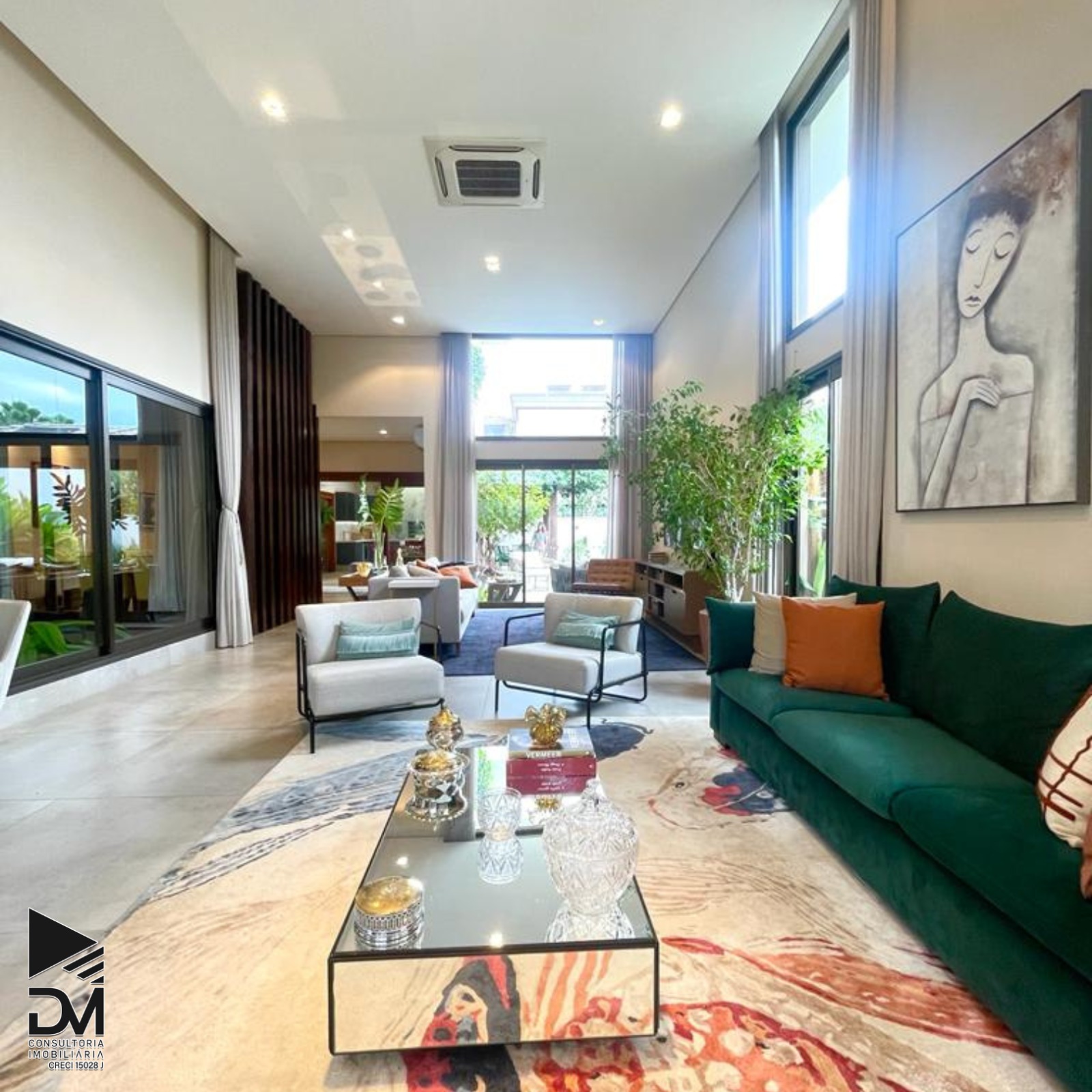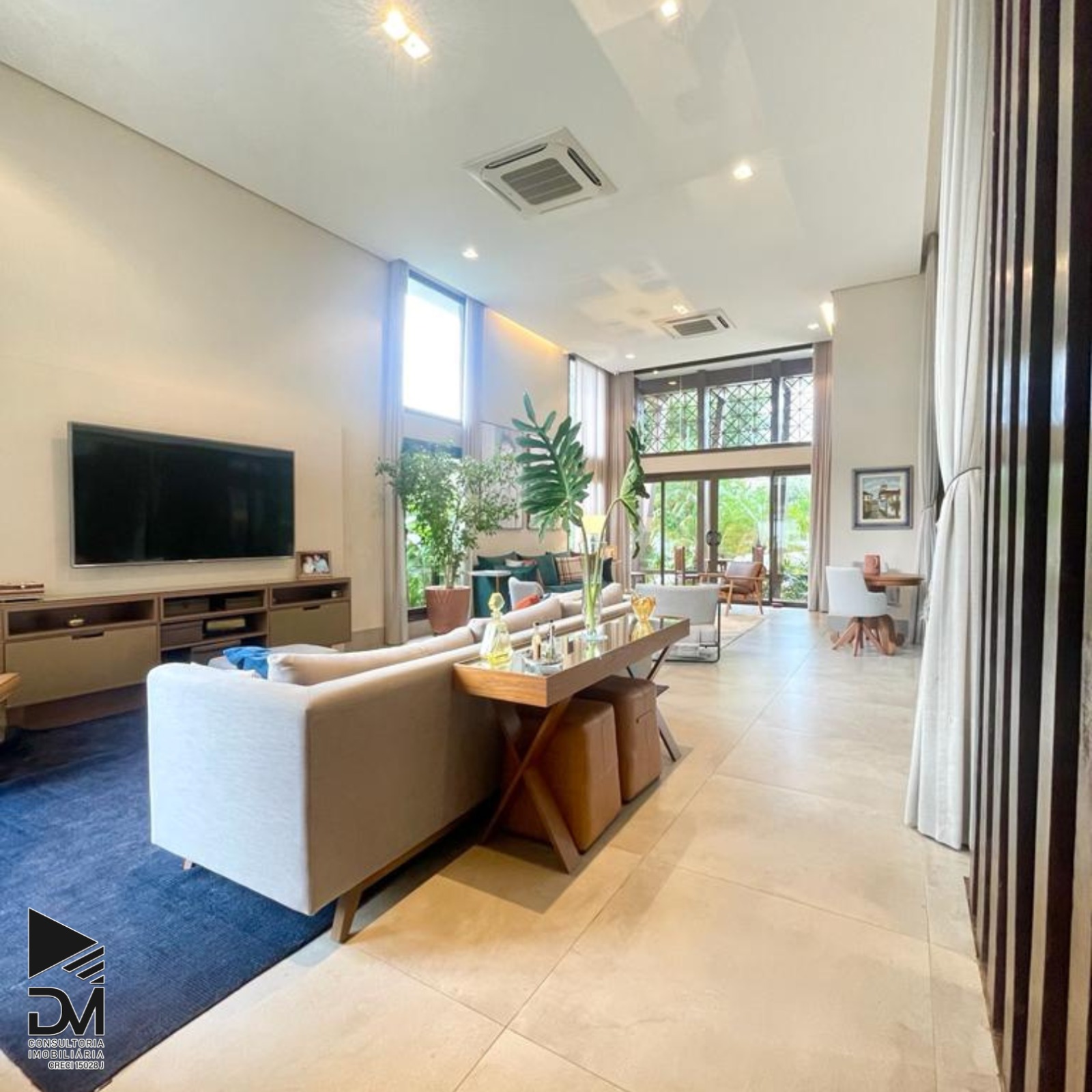 Sala ampla com pé direito duplo.